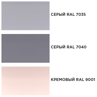 Цвета отделки: кремовый RAL 9001, серый RAL 7035, серый RAL 7040, ментоловый RAL 6019, пастельно-голубой RAL 5024
