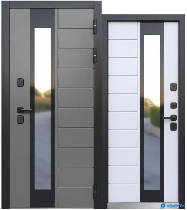 • Внешнее покрытие: атмосферостойкое порошково-полимерное "Чёрный муар", фрезерованная МДФ-панель 12 мм, цвет отделки полотна (эмаль): RAL 7024, цвет отделки наличников (эмаль): RAL 9005