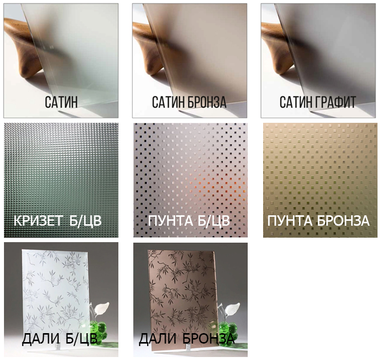 - варианты остекления (4 мм): Сатин (матовое); Сатин (бронза, графит); Кризет, Пунта, Дали (бесцветное, бронза); прозрачное