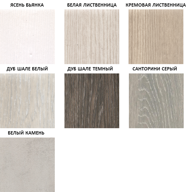 - цвета покрытия: Ясень бьянка, Кремовая лиственница, Белая лиственница, Белый камень, Дуб шале тёмный, Дуб шале белый, Санторини серый, Белый